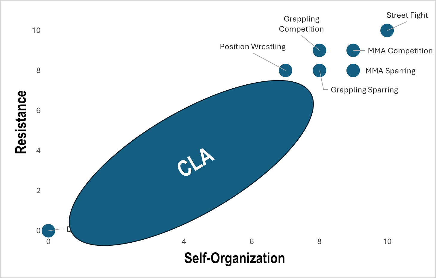 You’ll notice that there is a huge hole in the middle of the chart. To me this is where CLA nicely fits. It provides a way to move the learner from a low level of skill to a higher level where they can handle more open sparring. Here I will talk about using constraints to adjust both resistance and degrees of freedom.
