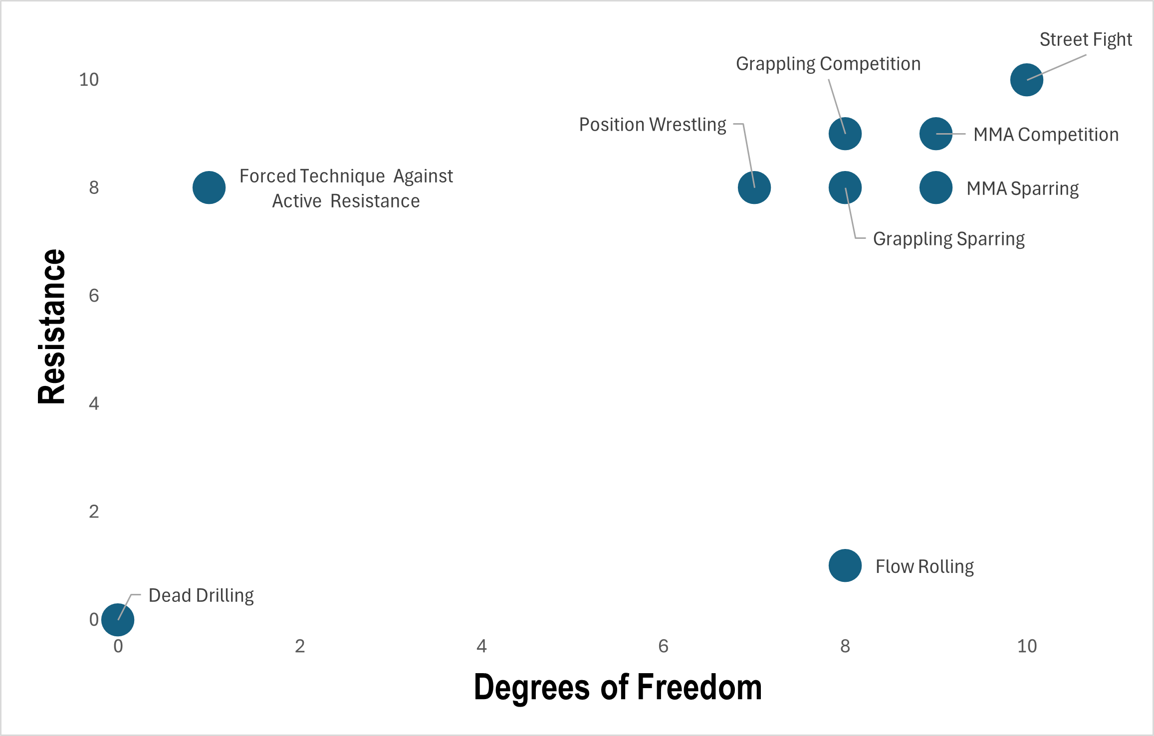 Implied in the discussions that I have heard is that there is a distinct jump from dead practice to liveliness, but once that jump is made, different activities can be more or less lively. So, there is a continuum of liveliness. Below is my attempt to map this continuum. Resistance is on the Y axis and degrees of freedom is on the X. In the top right corner, I put a street fight. It is maximum resistance. Your opponent is, at the very least, trying to kick your ass and might be trying to murder you. There are no rules. Your opponent can literally hit you with the kitchen sink. Just under that, I put an MMA competition. MMA has the least restrictive rule set but still has rules, and a serious competition fight is going to produce a level of resistance just under the street fight. Next to that, we have a grappling competition (of course it could be any other martial arts competition). The rule sets are going to be more restrictive than MMA, but the competition aspect is going to produce a lot of resistance. Then we drop down to in-class sparring. The intensity is less because it is just in class (although we all know that some students want to fight to the death), and movement is constrained by the rule set you are using. I placed position wrestling to the left of in-class sparring because the students are being constrained to starting in a particular position. Then we drop down to the lower left corner and have dead drilling. There is no resistance. Your partner is just a dummy. There is also no freedom of movement because you are trying to execute a technique in the exact way you have been shown.